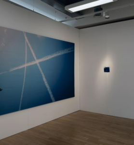 Steviee explained that when organising the exhibition, the curator Jonathon Weston suggested the idea of having the small Cyanotype next to the massive march contrails to create a size difference and a more striking effect.