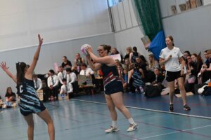 A Sunderland Netball player looks for a pass whilst York Saint John fans watch in the background