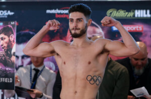 R78KCX Josh Kelly weighs in ahead of his fight with David Avanesyan on the Matchroom Boxing show in Sheffield, South Yorkshire, United Kingdom.