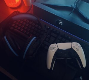 Girl playing game on ps5 at desk. Photo credit: Calum Bryan